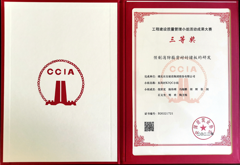 預制消防箱背襯封堵板的研發榮獲工程建設質量管理小組活動成果大賽三等獎(國家級)