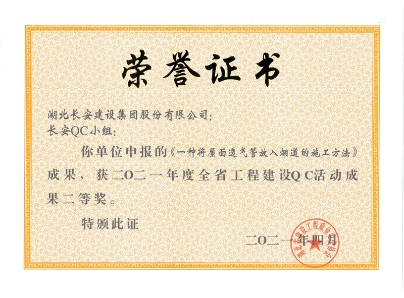 • 一種將屋面透氣管放入煙道的施工方法(2021年度湖北省QC活動成果Ⅱ等獎)