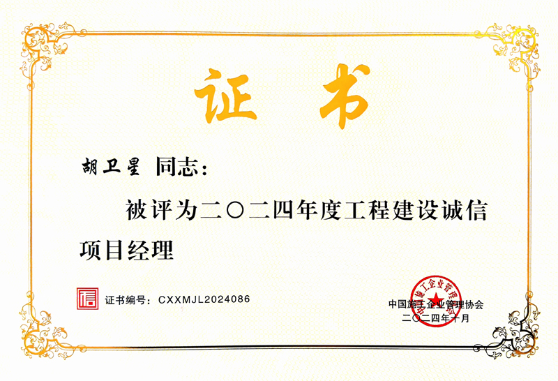 集團公司項目經(jīng)理胡衛(wèi)星獲評二○二四年度工程建設誠信項目經(jīng)理榮譽稱號