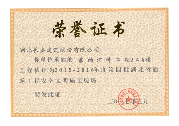 塞納河畔二期24#樓被評為2015-2016年度第四批省安全文明施工現場([2017}7號)