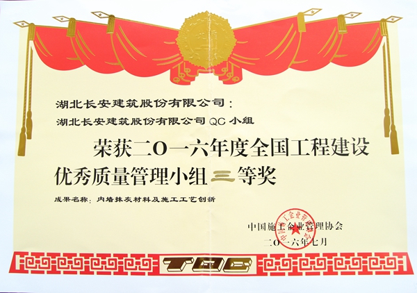 公司及QC小組榮獲2016年度全國工程建設優秀質量管理小組三等獎(內墻抹灰材料及施工工藝創新)