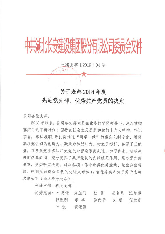 關(guān)于表彰2018年度 先進(jìn)黨支部、優(yōu)秀共產(chǎn)黨員的決定
