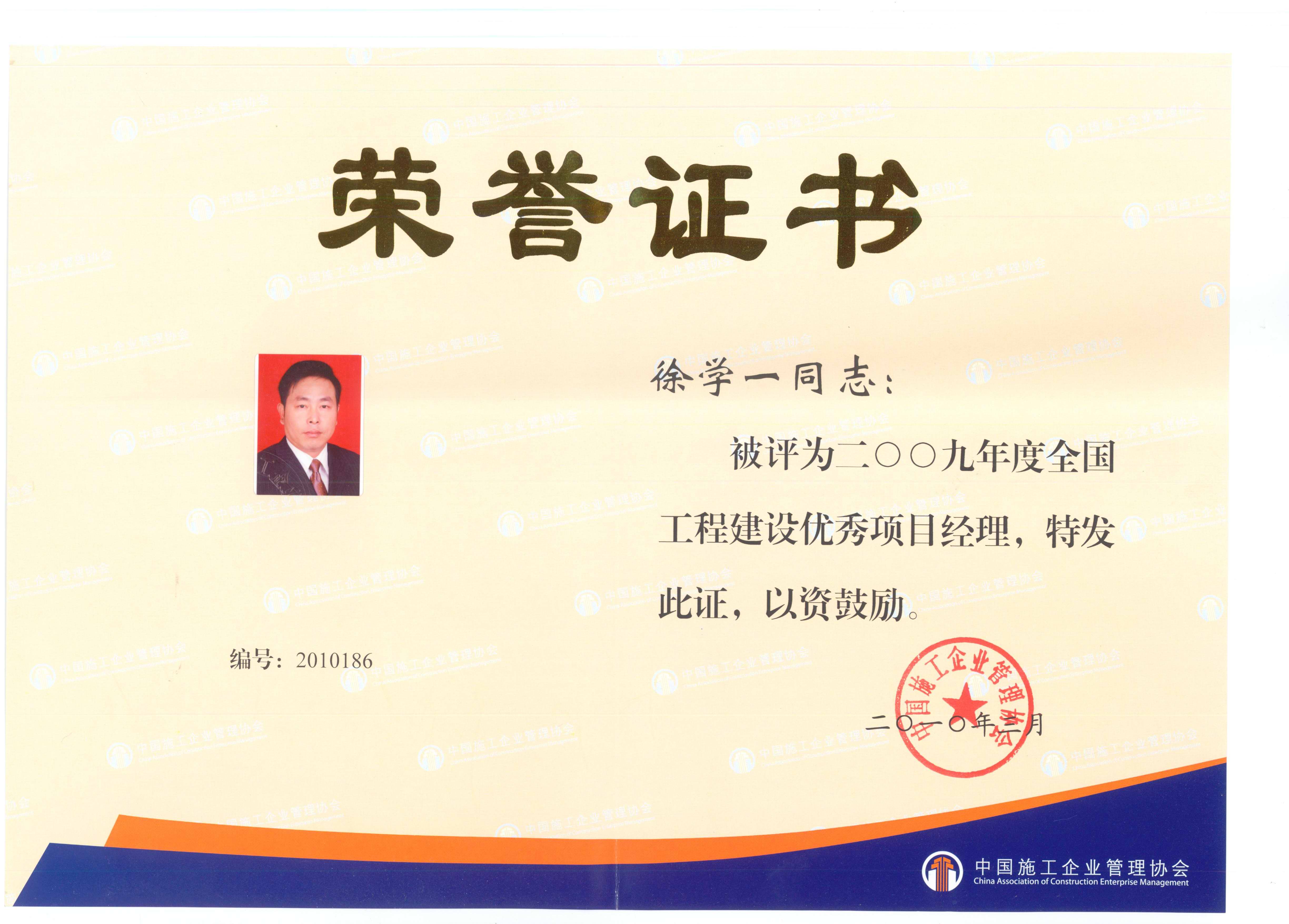 2009年度全國工程建設(shè)優(yōu)秀項(xiàng)目經(jīng)理(徐學(xué)一)