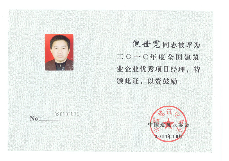 2010年度全國建筑業優秀項目經理(倪世寬)
