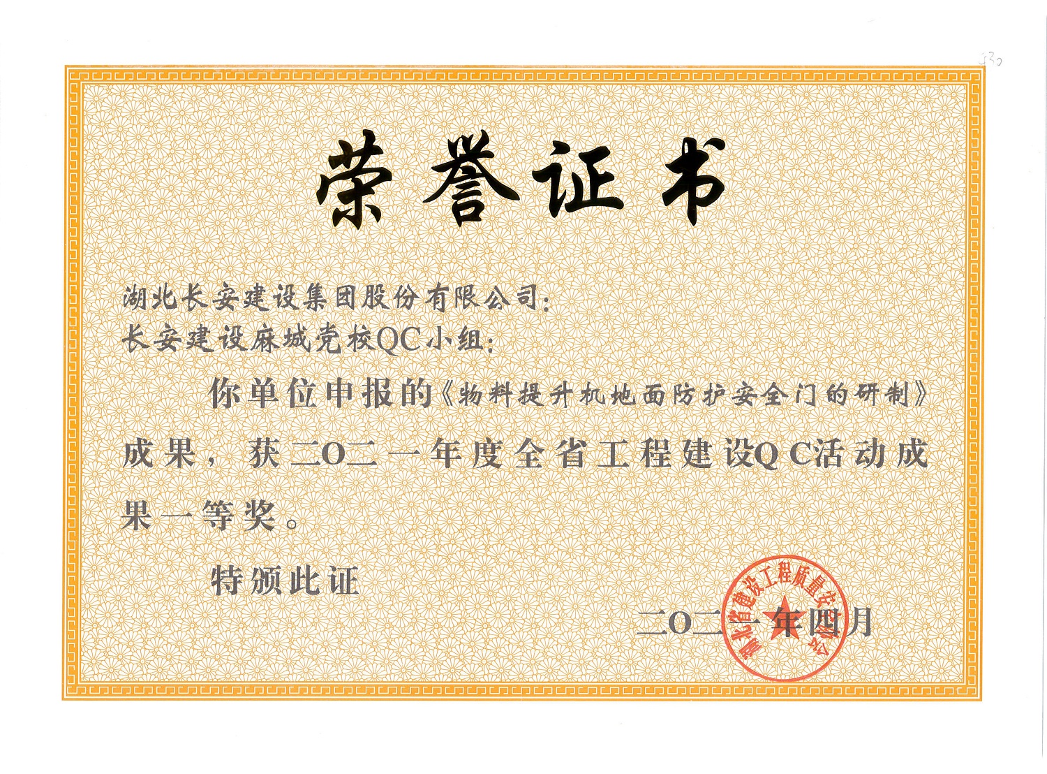麻城黨校QC小組長安建設麻城黨校QC小組成果——《物料提升機地面防護安全門的研制》榮獲2021年度省QC活動成果一等獎