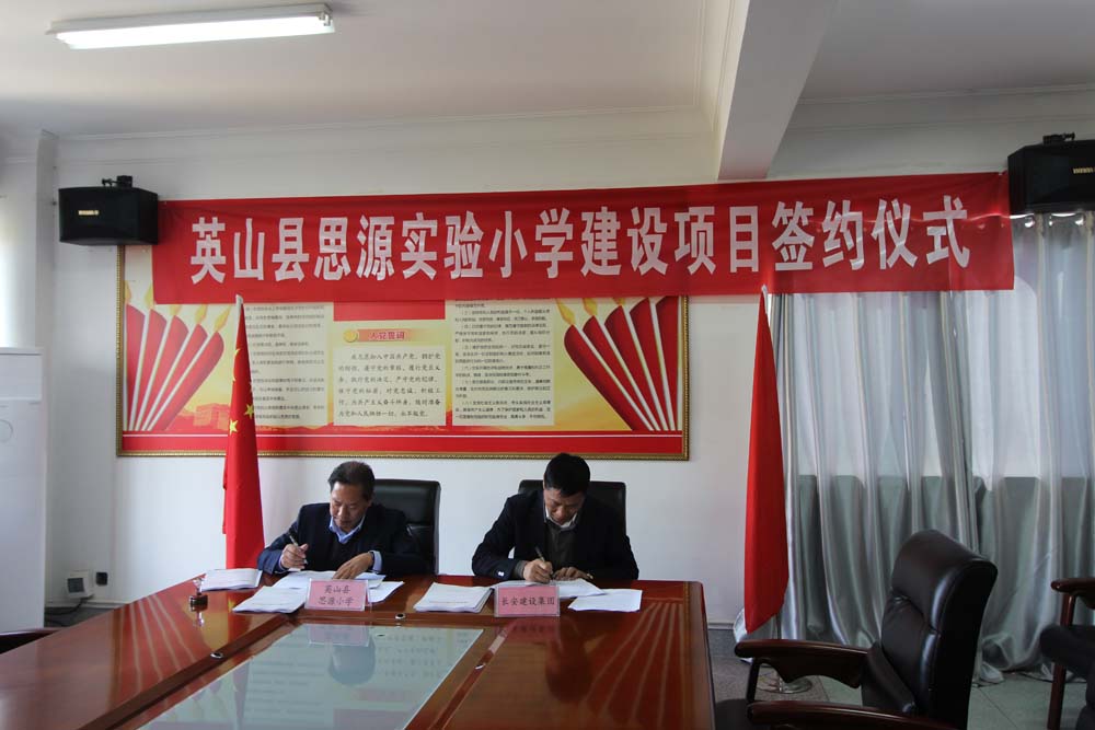 11月5日上午,英山縣思源實驗小學建設項目簽約儀式在長安建設集團四樓會議室舉行。建設單位英山縣思源小學校長周文革與施工單位長安建設集團董事長段衛昌出席簽約儀式并在合同書上簽字。