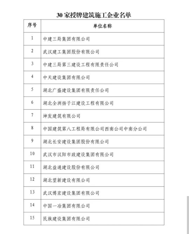 全省建筑工程質量管理30強企業出爐 湖北長安建設集團股份有限公司位列前十