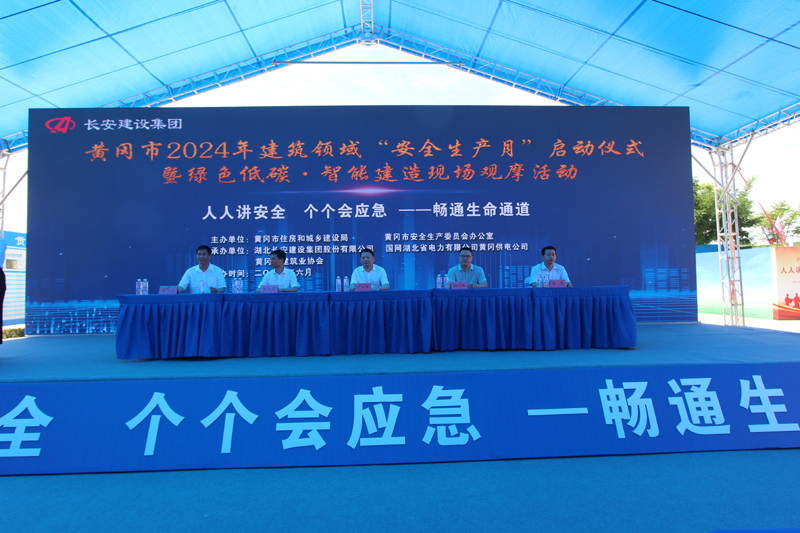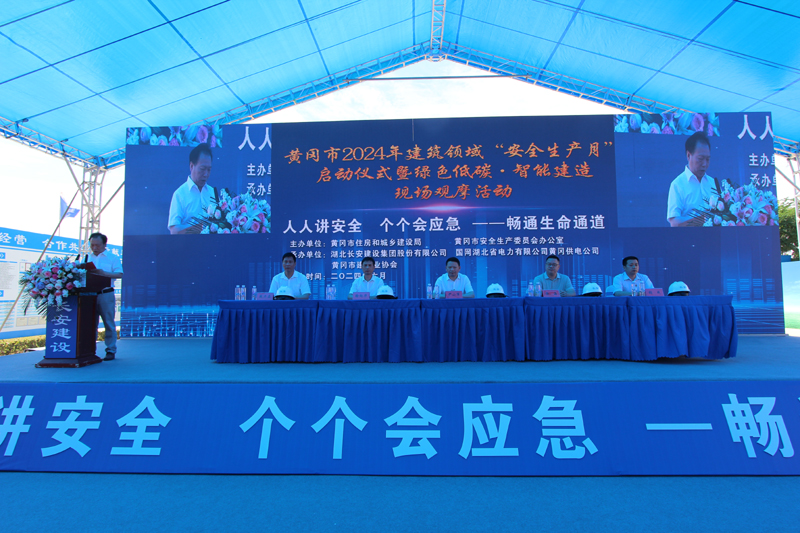 2024年6月是第23個全國安全生產月,主題為“人人講安全、個個會應急—暢通生命通道”。為了進一步強化安全意識壓實安全責任提高應急處置能力,由黃岡市住房和城鄉建設局、黃岡市安全生產委員會辦公室主辦以及湖北長安建設集團股份有限公司、國網湖北省電力有限公司黃岡供電公司、黃岡市建筑業協會協辦的黃岡市2024年建筑領域“安全生產月”啟動儀式暨綠色低碳?智能建造現場觀摩活動,于6月3日在國網湖北省電力有限公司黃岡供電公司生產綜合用房項目舉行。國網湖北省電力有限公司黃岡供電公司三級職員張成同志致歡迎辭,湖北長安建設集團股份有限公司副董事長、總經理葉發保作經驗交流發言。黃岡市住建局黨委書記、局長尹小軍以及黃岡市建筑業協會會長、湖北長安建設集團董事長段衛昌出席會議并講話,與主席臺領導嘉賓共同啟動觸摸球,標志國網湖北黃岡供電公司生產綜合用房項目為引領的黃岡市2024年建筑領域“安全生產月”活動正式啟動,全面展開。