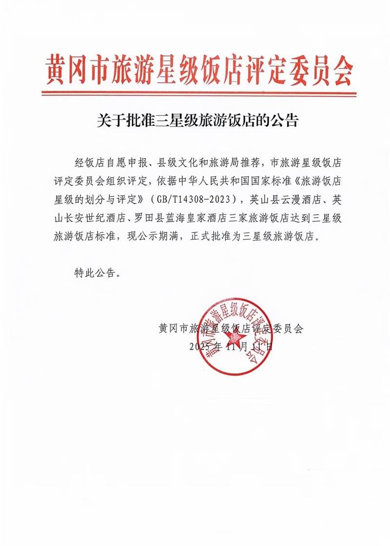 熱烈祝賀長安世紀酒店獲評“三星級旅游酒店”