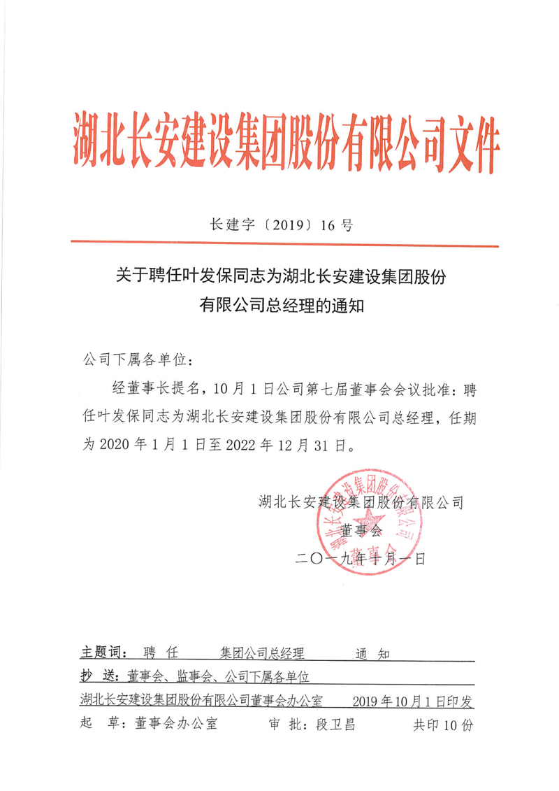 關(guān)于聘任葉發(fā)保同志為湖北長安建設(shè)集團(tuán)股份有限公司總經(jīng)理的通知