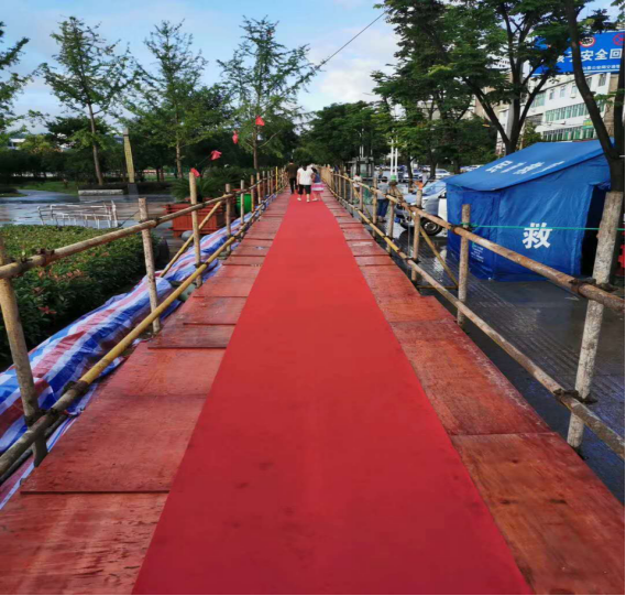 當(dāng)晚21:30,高一米、寬約兩米、總長約1000米、橋面鋪設(shè)溫馨紅地毯的“防洪橋”,宛如一條長龍,靜臥于夜色中。有效避免洪水倒灌,確保學(xué)生不涉水,為7月7日—8日高考生順利出入考場提供便利。此舉引起強烈反響,大量英山群眾、英山外出務(wù)工人員、學(xué)生家長紛紛點贊,長安建設(shè)集團勇于擔(dān)當(dāng)?shù)拇髳坌袨閺V受好評。