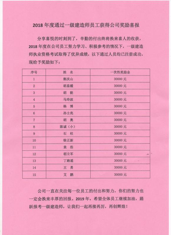 2018年度通過一級建造師員工獲得公司獎勵