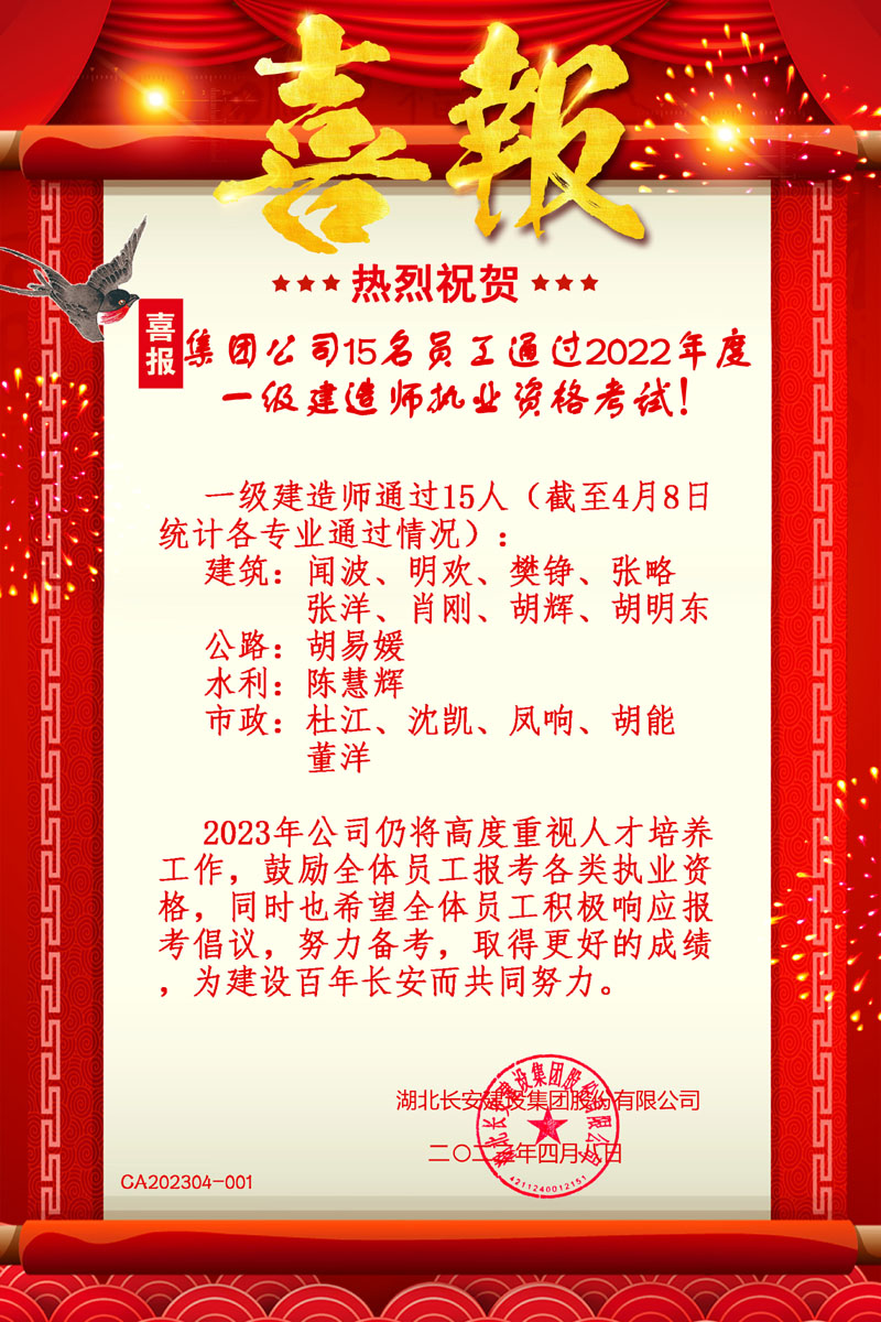 集團公司15名員工考取2022年度一建執業資格